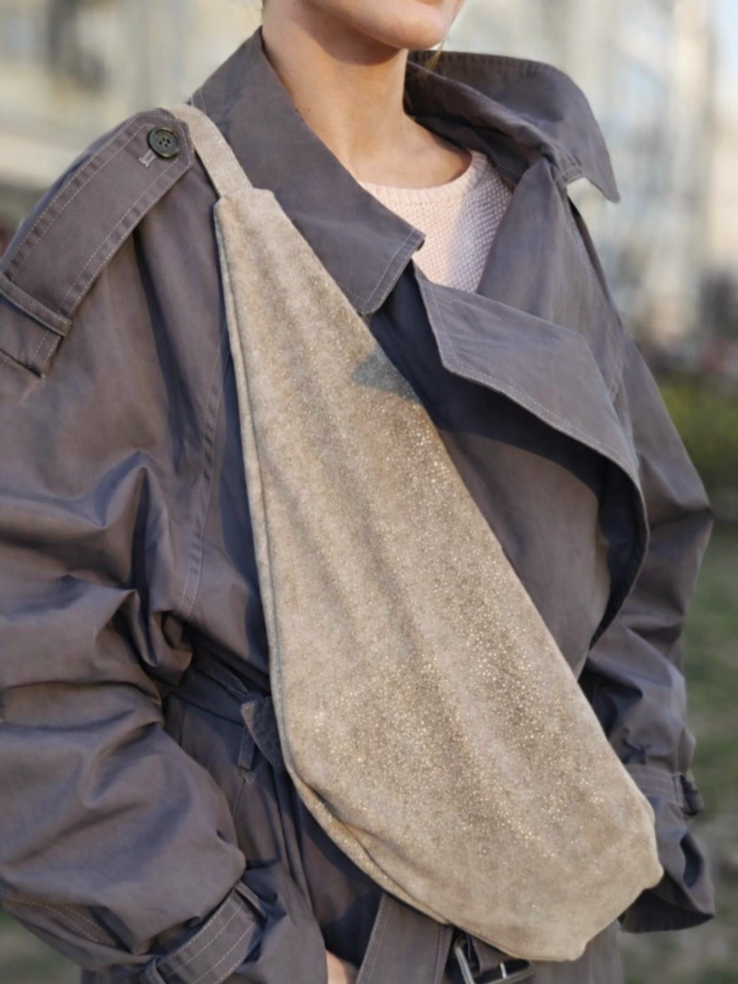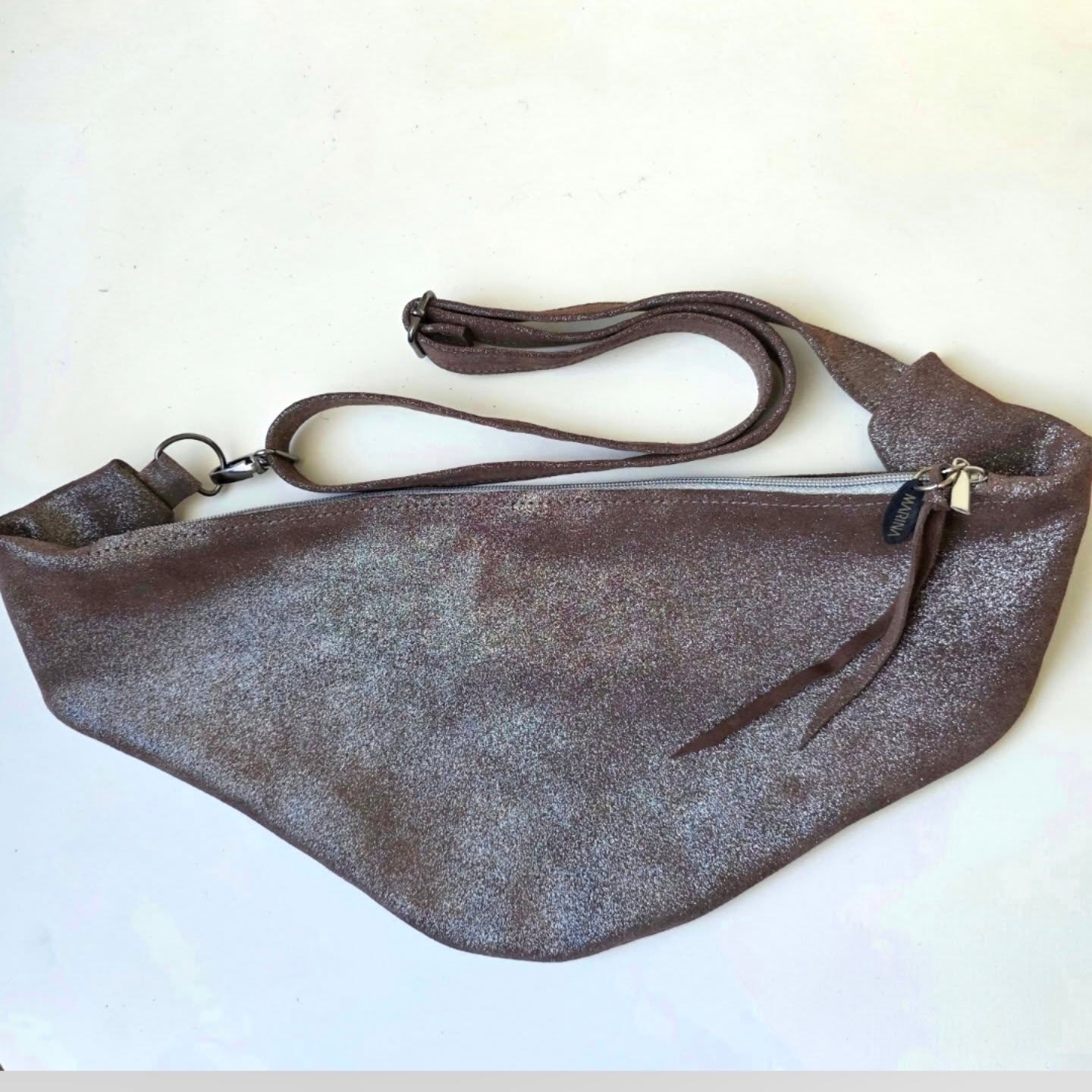 Braon tašna sa srebrnim sjajem od velur kože. Pojas sa regulatorom do 120 cm. Može da se nosi preko ramena ili oko struka. Uz svaku tašnu na poklon dobijete mali novčanik i privesak za ključeve.