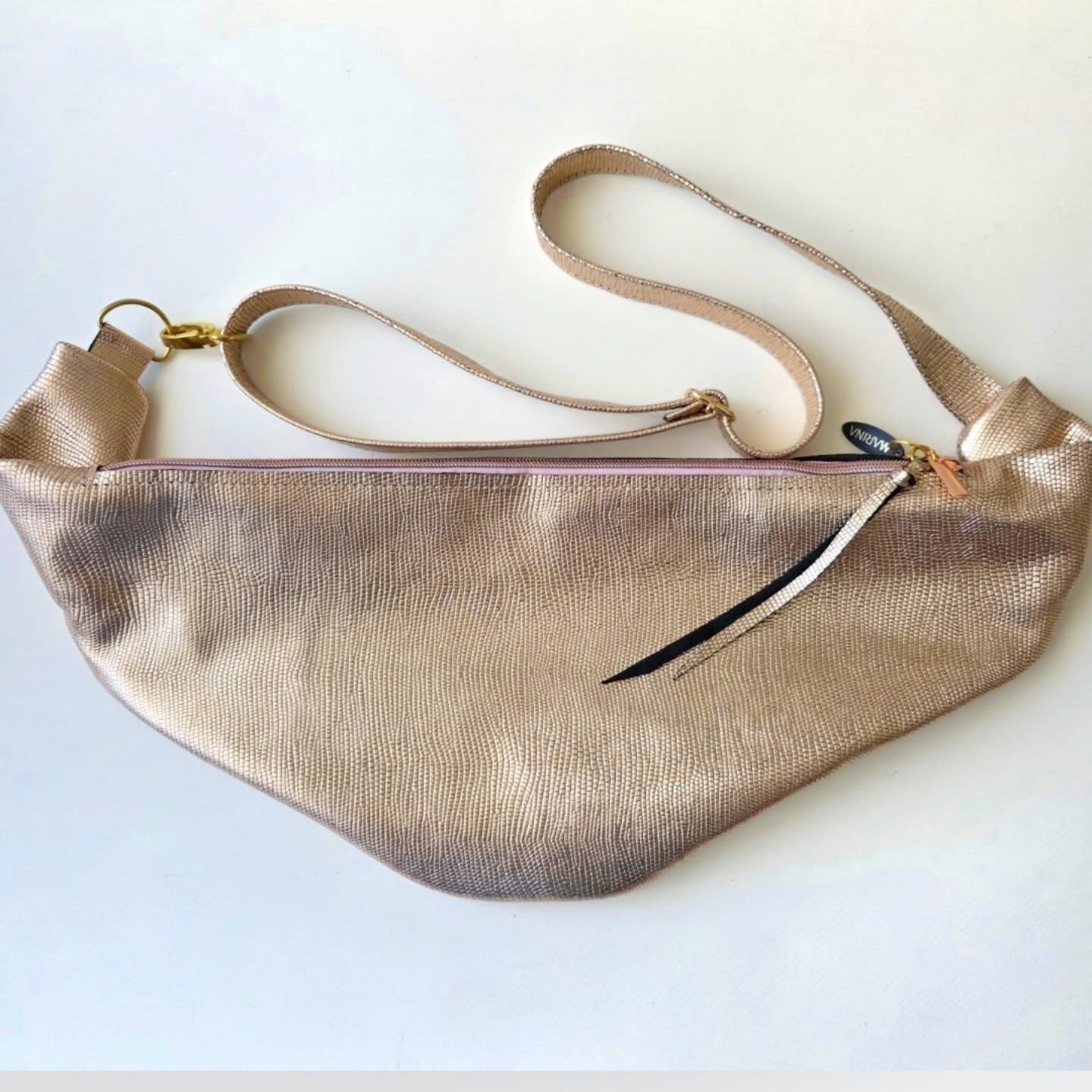 Rose gold sjajna tašna od napa kože. Pojas sa regulatorom do 120 cm. Može da se nosi preko ramena ili oko struka. Uz svaku tašnu na poklon dobijete mali novčanik i privesak za ključeve.